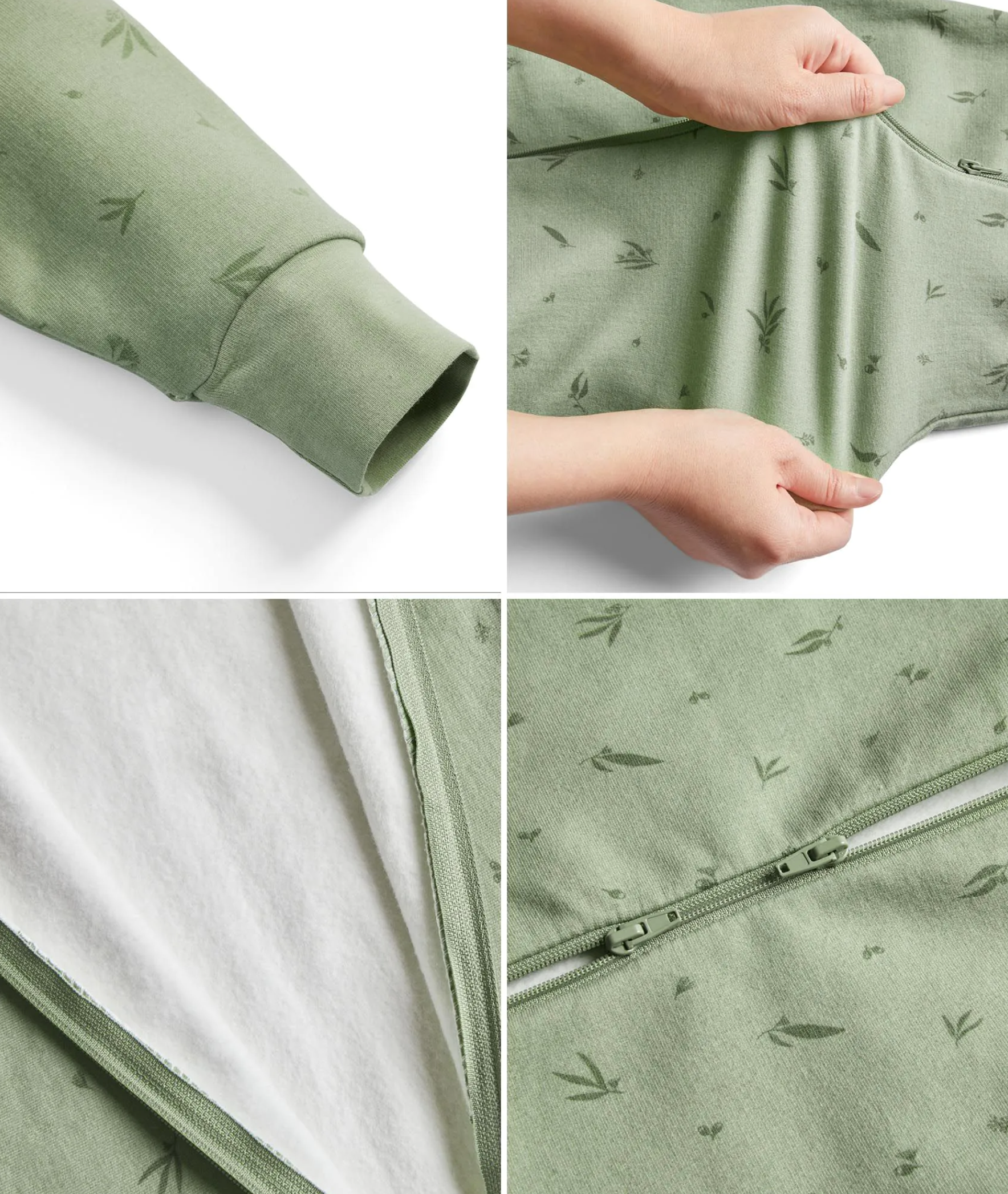 Extra stretchy sleeping bag for children and babies, made of organic cotton jersey and bamboo. Excellent for those who want a sleeping bag that is as soft as a T-shirt! Sizes: 3-12 and 8-24 months. Mild model with heat rating 1 TOG. Pattern "Willow" with dark green willow leaves on light green background.
