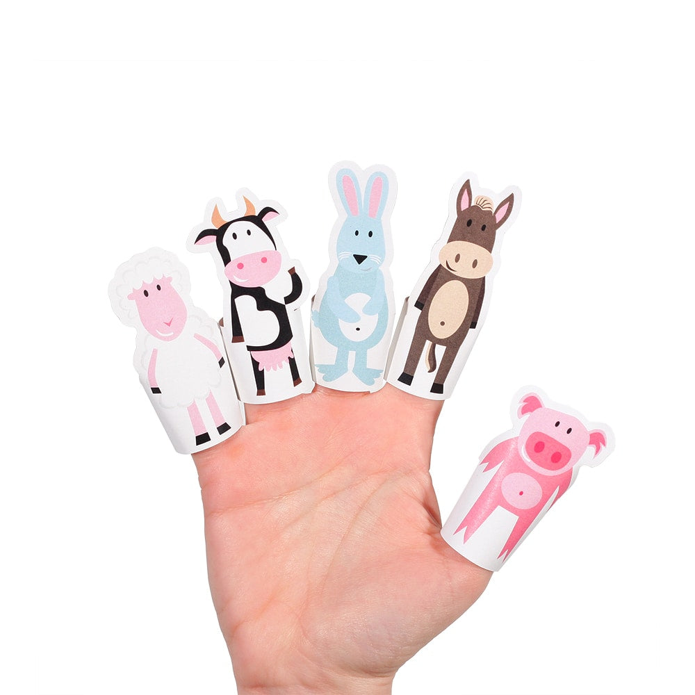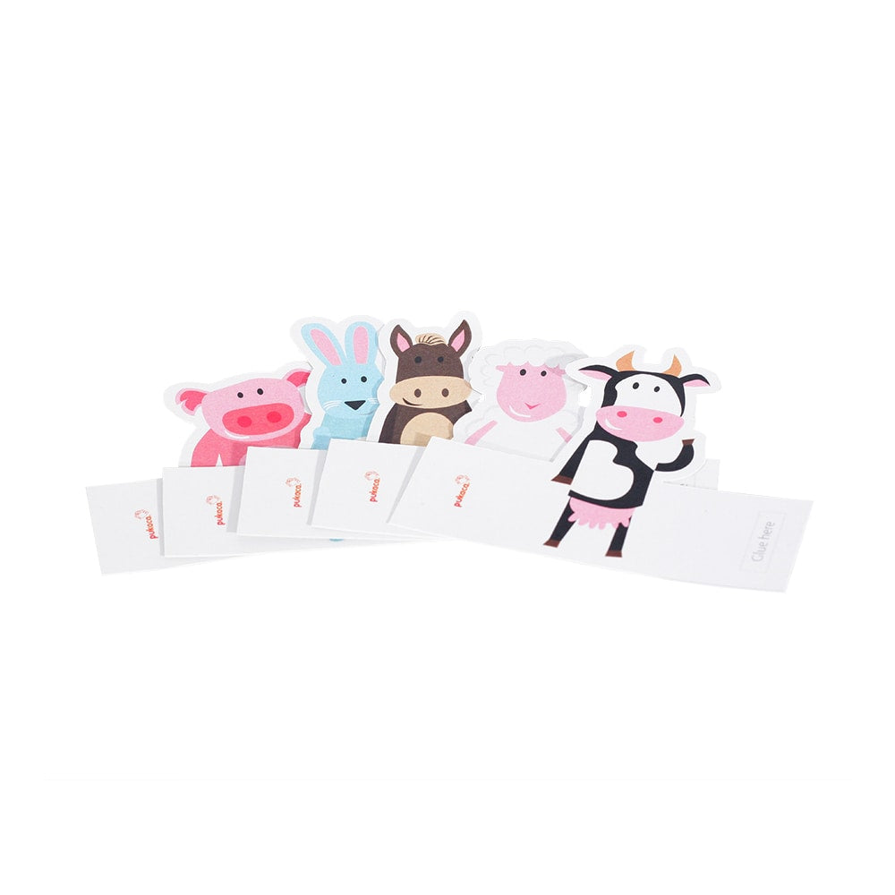 Paper finger puppets in the shape of farm animals from Pukaca. Sheep, cow, rabbit, horse, and pig of paper that can be mounted as finger puppets. If you have a small toy house at home, why not create a unique and creative world where little fingers might go into the barn and come out as a completely different animal? Many children's songs are based around these animals too, so maybe play and sing together with the different animals as inspiration.