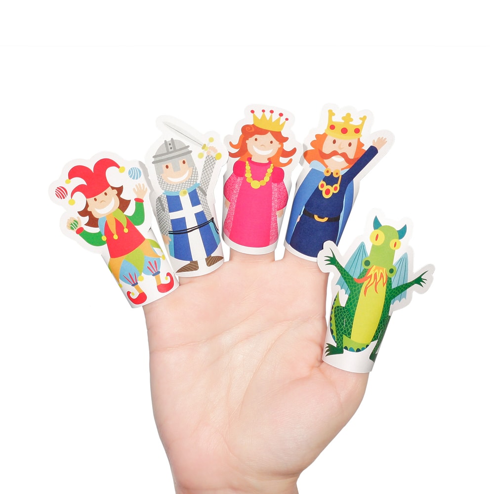 Paper finger puppets with Medieval thema from Pukaca. Royal couple, knight, joker and a dragon, for creative storytelling. Who knows what might happen when a knight and a dragon become best buddies?!