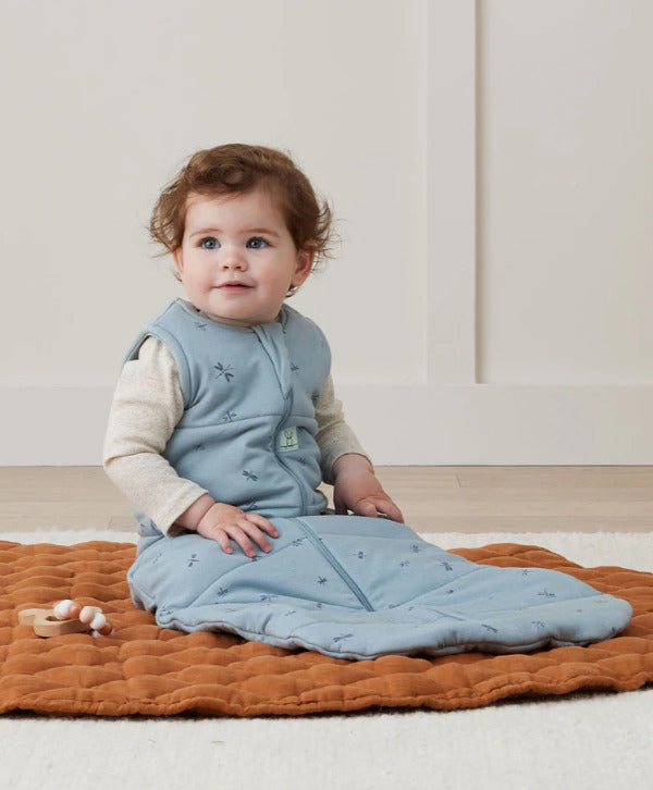 Extra stretchy sleeping bag for children and babies, made of organic cotton jersey and bamboo. Excellent for those who want a sleeping bag that is as soft as a T-shirt! Sizes: 3-12 and 8-24 months. Warm model with heat rating 2.5 TOG. Pattern "Dragonflies" with dark blue dragonflies on a light blue background.