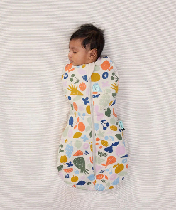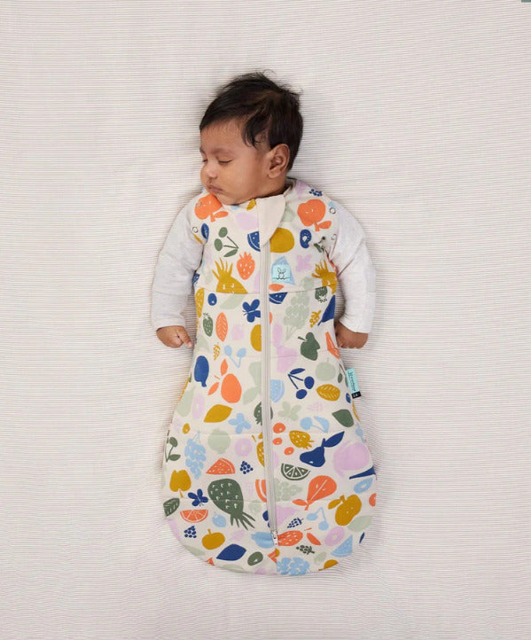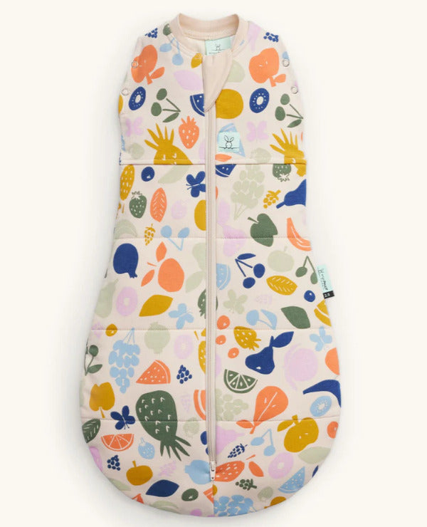 Safe, ergonomic and comfortable swaddle and sleeping bag in one! Made from high quality non-allergenic organic cotton and bamboo with a little elastane for stretch. Two sizes: 0-3 and 3-6 months . Warm model with heat rating 2.5 TOG. Pattern "Fruit Salad" with different coloured fruits on a beige background.