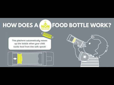 Because the bottle cannot be squeezed, the risk of your child squeezing out the food instead of eating it is reduced. Babies from about 6 months can suck from the soft silicone nozzle and see the platform in the bottle go up! The window where the filling level is visible tells both children and parents how much is left in the bottle.